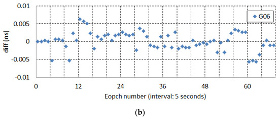 Figure 8. (a) Detailed differences between decentralized clock estimation (DECE) and undifferenced (UD) clock (G02). (b) Detailed differences between DECE and UD clock (G06).