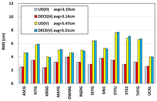 In the experiment, the RMS of the position differences using DECE and UD products are shown in Figure 12, in which the legend H and V mean horizontal and vertical direction, respectively. All results are counted after PPP convergence. The statistics show that the average RMS is about 3.10 cm for using UD and 3.14 cm for DECE in horizontal, and 5.47 cm for using UD and 5.51 cm for DECE in vertical. In general, for PPP, centimeter-level positioning results can be achieved using the clock products. Normally the result of UD is a little better than DECE, but there is almost no difference in the accuracy between using DECE and UD products.