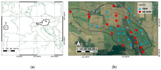 Since April 2017, an in-situ network of low-cost sensors (Flower Power, Parrot []) measuring both soil moisture and incoming solar radiation has been installed in the catchment []. The selection of the sensor locations follows the design employed by Vreugdenhil et al. [] for the validation of coarse-scale soil moisture products over the same area []. In this study, we used 38 low-cost sensors covering a wide range of soil texture and topographic conditions (Supplementary Figures S1 and S2). Nineteen sensors were installed within agricultural fields and temporarily removed during field management practices (planting, harvesting, ploughing, etc.) and are referred to as CROP (Supplementary Figure S3). The remaining 19 sensors were permanently positioned in forest and grassland sites, as well as at the edges of agricultural fields (NO-CROP, Figure 1b). The original readings of the low-cost sensors, taken every 15 min, were resampled to daily averages.