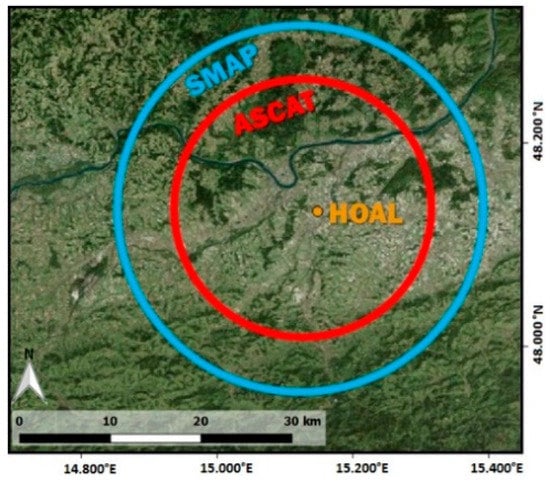 Here, we employed two state-of-the-art remotely sensed soil moisture products that guarantee adequate temporal frequency for agricultural and hydrological applications. We selected active C-band (advanced scatterometer (ASCAT)) and passive L-band (soil moisture active passive (SMAP)) soil moisture products, to assess the robustness of the downscaling approach with respect to different observation frequencies and sensing techniques. An assessment of the ASCAT and SMAP products using ground-based measurements is given, e.g., in [,], respectively. Figure 2 shows the area (approximately) covered by the ASCAT and SMAP footprints compared to the study catchment. Notwithstanding the considerably larger area observed by the satellite products, the HOAL is representative of the topographic conditions and land cover classes captured by ASCAT and SMAP [].