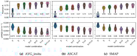 Violin plots of Pearson R (top) and unbiased root mean square deviation (uRMSD) (bottom) between measured and predicted soil moisture (see Table 1). The soil moisture source used as predictor (surface soil moisture (SSM)) is displayed above each graph: AVG_insitu (a), ASCAT (b), and SMAP (c). The different model combinations are reported on the X-axis: S indicates “soil texture”, T indicates “topography”, and V indicates “vegetation”. The boxplots within the violins depict quartiles, and the white dots indicate the median values (also reported below the violins).