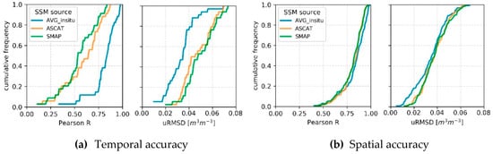 Cumulative frequency of Pearson R and uRMSD between measured and predicted soil moisture (model combination SSM+S+T+V). The statistical metrics were calculated for each sensor location, thus representing the ability of the model to capture temporal dynamics (a), and for each time-step, accounting for the model skill to reproduce spatial patterns (b).
