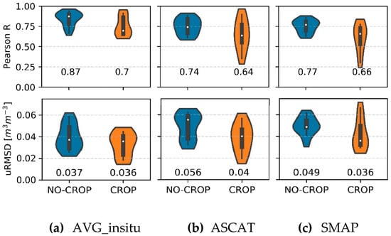 Violin plots of Pearson R (top) and uRMSD (bottom) between measured and predicted soil moisture (model combination SSM+S+T+V) depending on the vegetation type. CROP indicates agricultural fields, while NO-CROP includes grassland, forest, and field edges. The SSM source used as model predictor is displayed above each graph. The boxplots within the violins indicate quartiles and the white dots depict the median values (also reported below the violins). (a) AVG_insitu, (b) ASCAT, (c) SMAP.