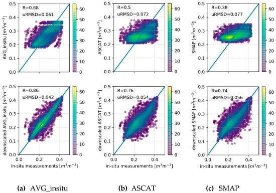 Scatterplots between measured soil moisture and original coarse-scale SSM products (top) and between measured and predicted soil moisture (model combination SSM+S+T+V) (bottom). The color indicates the number of observations. In each graph, the Pearson R and uRMSD are given. (a) AVG_insitu, (b) ASCAT, (c) SMAP.