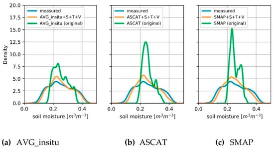 Density distributions of soil moisture obtained for in-situ measurements (blue lines), downscaled soil moisture from the model combination SSM+S+T+V (orange lines), and the original coarse-scale SSM products (green lines). (a) AVG_insitu, (b) ASCAT, (c) SMAP.