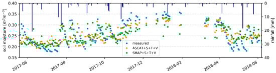 The model accuracy obtained in this study is similar to that reported in the review paper of Sabaghy et al. [] for various downscaling methods based on machine learning (R ≈ 0.80, RMSD = 0.056 m3 m−3 on average). However, we found that the skill greatly improved (R = 0.87, uRMSD = 0.037 m3 m−3) if more representative SSM sources (i.e., AVG_insitu) are provided as input to the model instead of using coarse-scale remotely sensed products (ASCAT or SMAP). Therefore, our results highlight the importance of the SSM source provided as input to the model to produce satisfactory estimates. Indeed, satellite-derived products are subject to considerable challenges and difficulties, such as the extraction of soil moisture from the retrieved signal (either backscatter or brightness temperature), leading to random and/or systematic errors []. In our analysis, an additional source of error is the spatial mismatch between the satellite footprint and the size of the study site. To reduce uncertainties arising from the spatial representativeness, newly developed products could be used as SSM predictor. For example, Sentinel-1 observations allow estimating surface soil moisture at a spatial resolution of 1 km and a revisit time up to four days over Europe []. However, the temporal frequency of Sentinel-1 might still be insufficient for some applications. To overcome this issue, novel approaches fusing ASCAT and Sentinel-1 soil moisture products have been developed, preserving the temporal resolution of ASCAT while improving the spatial details []. Both products could reduce the spatial mismatch between the study site and the satellite pixel size leading to more accurate soil moisture estimates.