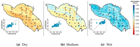 Soil moisture spatial patterns obtained from the model combination ASCAT+S+T for three days with dry, medium, and wet conditions, are shown in Figure 9 (note that these days were not part of the training data). We did not use the best-performing model (i.e., SSM+S+T+V), which also includes information about vegetation cover, because fAGR was available exclusively for the sensor locations and not for the entire catchment. The predicted patterns derived from the SMAP+S+T combination are not shown because they are very similar to those obtained for ASCAT+S+T.