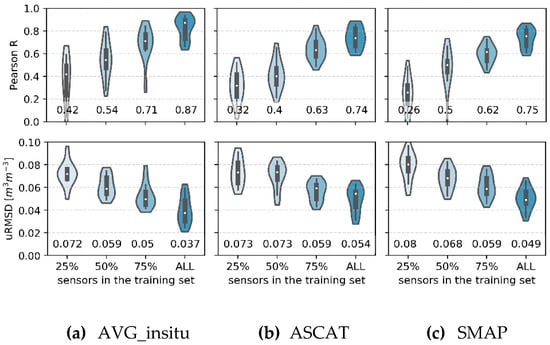 Violin plots of Pearson R (top) and uRMSD (bottom) between measured and predicted soil moisture (SSM+S+T+V) against the number of sensors used to train the models. Training sets consisted of 25%, 50%, and 75% of all available sensors (38), each sensor covering the same time interval of the original training set. For each training set size, we repeated the evaluation for 10 random permutations. The SSM source used is displayed above each graph. The boxplots within the violins indicate quartiles and the white dots depict the median values (also reported below the violins). (a) AVG_insitu, (b) ASCAT, (c) SMAP.
