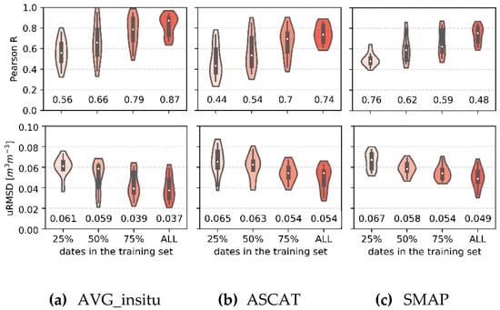 Violin plots of Pearson R (top) and uRMSD (bottom) between measured and predicted soil moisture (SSM+S+T+V) against the number of dates used to train the models. Training sets consisted of 25%, 50%, and 75% of contiguous observations sampled from the original training sets (ALL). Note that all the available sensor locations are included. For each training set size, we repeated the evaluation for 10 random permutations. The SSM source used as model predictor is displayed above each graph. The boxplots within the violins indicate quartiles and the white dots depict the median values (also reported below the violins). (a) AVG_insitu, (b) ASCAT, (c) SMAP.