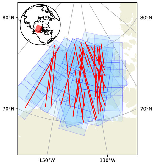 Beaufort Sea study area: Sentinel-1 images are shown in blue and the red lines represent the CryoSat-2 altimeter ground tracks. The inset in the upper left corner shows the location of the study area in the Arctic.