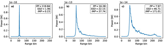 Example waveforms for different surface types. (a) Lead, (b) first-year and (c) multiyear sea ice. Note the difference in the scaling of the y-axis.