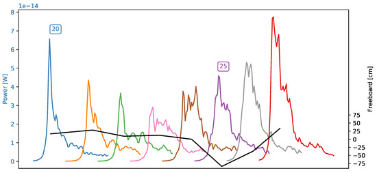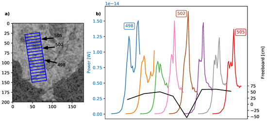 Figure 3 shows an example of waveform evolution over a multiyear sea ice floe taken on 18 February 2018. Time separation between the SAR image and altimeter measurement is just a few minutes. The circular, darker SAR signature between samples 502 and 505 probably represents a smoother ice surface. The highly negative freeboard for sample 502 is related to the deformed, slightly kinked leading edge. The strong peak can no longer be distinguished from the first peak as in the waveforms before and after. While this is an exaggerated example with highly negative freeboard, this can also cause an underestimation of sea ice thickness in less affected cases. Freeboard measurements represent radar freeboard, i.e., the scattering horizon of the radar waves that usually falls somewhere between the air-snow and snow-ice interface [26]. Sea ice thickness is of primary interest but estimation of it requires auxiliary information about snow load and physical and electromagnetic properties of the sea ice, which is beyond the scope of this study.