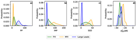 The first step of our analysis focusses on the altimeter waveform and SAR image parameters of different ice types. Figure 4 shows the waveform parameter statistics (a–c) and HV backscatter coefficient (d) of FYI, MYI and large leads accumulated over the three winter seasons 2015/16, 2016/17 and 2017/18. The three ice types are clearly distinguished by the waveform parameters, but the distributions also show a large overlap. FYI waveforms have a large PP, i.e., most of the backscattered power is located in the maximum peak, and a low SSD value, i.e., the contributions to the multi-looked waveform are confined to a smaller incidence angle range. Furthermore, FYI waveforms have a larger mean power compared to MYI as shown by the low values of IMP. MYI waveforms contain energy from a larger range of incidence angles, i.e., high SSD value, and the low PP indicates a smoother distribution of backscattered energy over the entire waveform. Leads are characterized by the highest PP, low SSD and high mean power. IMP enhances the contrast for FYI and MYI but reduces it for FYI and leads. FYI and MYI are well separated by the mean backscatter coefficient of the SAR image since the age of sea ice has a significant impact on the SAR backscatter intensity [24]. Large leads have a bimodal distribution of HV backscatter intensities that largely overlaps with the FYI values. The lower peak is caused by leads of new ice whereas the second peak at higher backscatter values represents leads that have started to form thicker ice but still contain areas of thin ice that cause a highly peaked response in the altimeter.