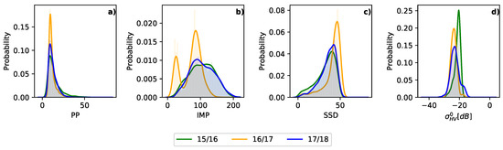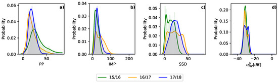 Waveform parameters of FYI for the different winter seasons. (a) Pulse peakiness, (b) scaled mean power, (c) stack standard deviation and (d) mean HV backscatter intensities of altimeter footprint. Solid lines represent a kernel density estimate from measured histograms.