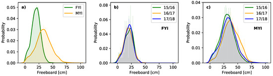 Freeboard distributions for (a) FYI and MYI of all winter seasons, (b) FYI and (c) MYI for the three winter seasons. Solid lines are kernel density estimates of the histograms.