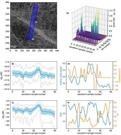 The first example in Figure 8 shows the local waveform variation and SAR imagery over a large ridge on 2016-03-15. The time lag between the SAR image and the altimeter track is below five minutes, i.e., for average drift speeds between 6 cm/s and 10 cm/s that means 18 m to 30 m. The ridge is clearly visible in the center of the cross-polarization SAR image by its higher backscatter caused by ice facets oriented towards the radar (Figure 8a–c). The altimeter on the other hand shows a lower peak intensity around the ridge because more energy is scattered away from the nadir-looking instrument (Figure 8d). PP is low over the ridge, while SSD and inverse mean power reach higher values (Figure 8e,f). This is characteristic for more diffuse scattering. Waveforms over FYI have a higher peak power with high PP and low SSD and inverse mean power. Notable is the large negative freeboard occurring for sample 25.