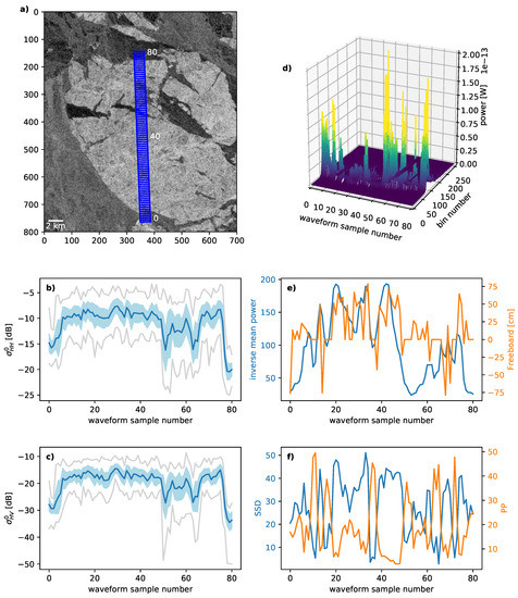 Figure 10 shows the SAR image and the spatial variation of altimeter waveforms of an old MYI floe embedded in thinner FYI. The data was taken on 22 February 2018 with a time separation of about 20 min, i.e., for average drift speeds between 6 cm/s and 10 cm/s that means 72 m to 120 m. The floe size along-track is approximately 24 km. In the SAR image, the MYI floe is characterized by high backscatter in co- and cross-polarization (Figure 10a) shows co-polarization) while the surrounding FYI has a lower backscatter. In the upper part of the MYI floe, some lead and low backscatter features are visible that are also reflected by reduced mean backscatter intensity and an increased standard deviation (light blue area in Figure 10b,c). The lower part of the floe looks relatively homogeneous. The waveforms in the interior of the floe show a low peak power with an exception around sample number 40 (Figure 10d). In this area the peak power is increased compared to before and after, but no feature is visible in the SAR image. The altimeter is very sensitive to smooth areas within the footprint that are too small to be resolved by the SAR but affect the measured waveform. Over the lower part of the MYI floe the freeboard estimate reflects the higher thickness of the MYI, but in the upper part of the floe, where smoother sea ice features affect the waveforms, freeboard is reduced. Therefore, in areas of mixed ice types sea ice freeboard more likely represents the smoother and thinner part of the ice. Negative freeboard is also observed in areas of changing sea ice surface at the beginning and end of the MYI floe. This example demonstrates the difficulties of obtaining robust freeboard even over relatively large and apparently homogeneous features, but careful observation of the changes in waveform shape facilitates explanation of the observations.