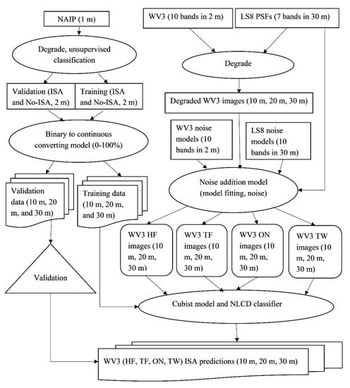 Procedures of mapping and assessing ISAs using WV3 images and Landsat (LS) 8 point spread function (PSF) with different SNRs.