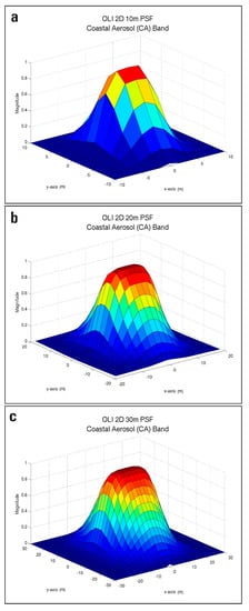 Subsampled Landsat OLI point spread function (PSF) for the coastal aerosol band at 10-m (a), 20-m, (b), and 30-m (c) resolutions.