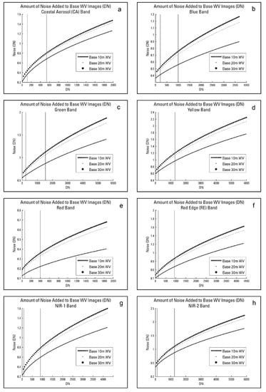 Figure 3 displays the actual noise added in each spectral band to the resampled WV3 imagery to obtain the desired fraction of the OLI SNR that is equivalent to the OLI SNR in this case. For lower SNR levels, more noise was added, and for higher SNR levels, less noise was provided. WV3 imagery has more the visible and near-infrared (VNIR) bands than the Landsat 8 OLI. Therefore, the OLI SNR for the red band was used for the WV3 yellow and red edge bands, and OLI SNR for the NIR band was used for the WV3 NIR1 and NIR2 bands.