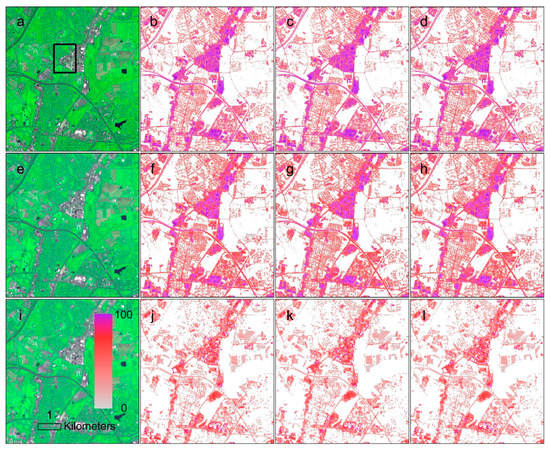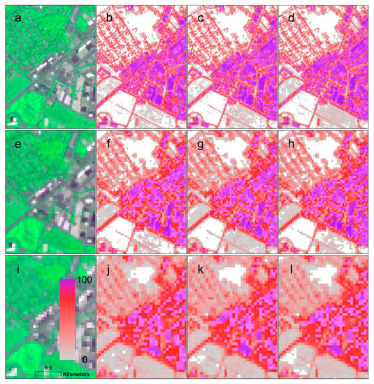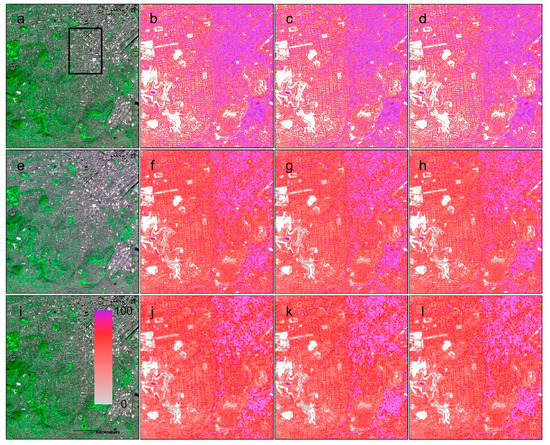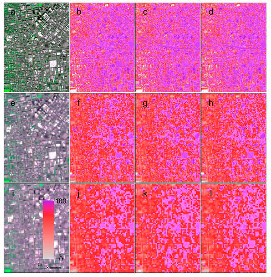 WV3 images at 10-m (a), 20-m (e), and 30-m (i) resolutions from the highlighted area in Figure 7a and derived ISAs from images with half, three-quarters, and twice the Landsat OLI SNRs at 10-m (b–d), 20-m (f–h), 30-m (j–l) resolutions. The non-ISAs are in white.