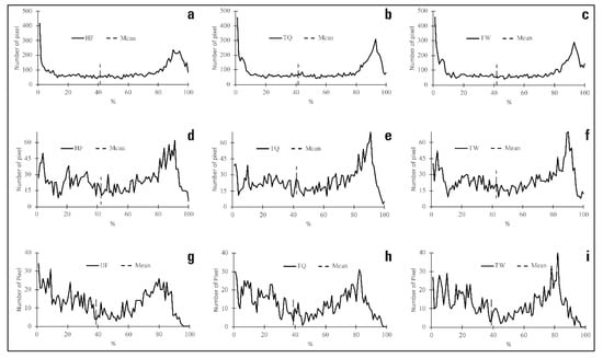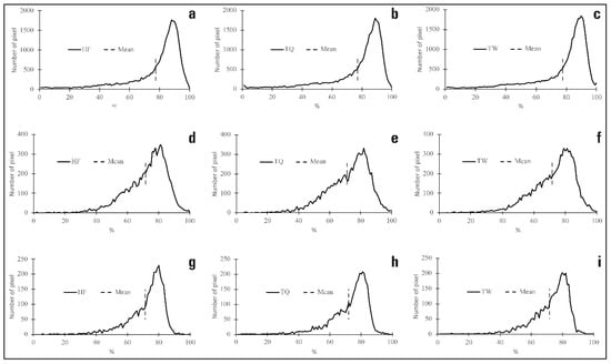 Histograms of derived ISA from a subset area highlighted in Figure 3. The X-axis is the percentage of ISA and the Y-axis is the total numbers of ISAs derived from images with half (HF), three-quarters (TQ), and twice (TW) the Landsat OLI SNRs at 10-m (a–c), 20-m (d–f), and 30-m (g–i) resolutions. The central vertical dashed lines in each panel represent the mean of the ISAs in each estimate.