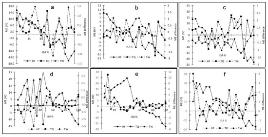 Furthermore, we evaluated the value of ME that was related to the RAE in the ISA estimate. To evaluate the distributions of ME associated with the intensity of the ISA, MEs with every 5% of ISA are displayed for Beltsville (Figure 10a–c) and San Francisco (Figure 10d–f). The MEs from HF are displayed as solid lines and differences of ME between TQ and HF and between TW and HF are shown as dashed lines. In Beltsville, the 10-m estimates (Figure 10a) showed that MEs from three SNR images did not have apparent differences: the ISA was overestimated in ranges below 50% and underestimated in ranges above 50%. The differences of MEs estimated from higher SNR images (TQ and TW) were positive in almost all ISA ranges, and the positive difference was large in the estimate with the TW SNR imagery, resulting in values of ME from negative to slightly above zero. In the 20-m estimates (Figure 10b), the ME from images with HF SNR showed overestimation below 45% and underestimation for most above 45% of ISA. The ME difference between TW and HF SNRs was positive in most ISA ranges, except at 85%. Such an increase in the ME value resulted in the smallest overall ME in the estimate using the image with TW SNR. The negative differences of ME in ranges below 45% of the ISA estimate from the image with TQ SNR indicated ISA underestimation. In the 30-m estimate (Figure 10c), the ME from the image with HF SNR was positive below 30% and negative above 30%. The magnitude of ME from the image with TQ SNR was slightly smaller than the magnitude from the image with HF due to a smaller underestimate in the higher ISA ranges (above 50%). However, the magnitudes from the estimate using the images with TW SNR did not have magnitudes of ME smaller than that derived from the image with HF SNR. The ISAs estimated using the image with TW SNR showed a slightly smaller ME in the ISA intensity less than 40%, as well as around 85%. In general, the overall ME values derived from WV3 images with TW SNR were smaller than those using images with HF SNR in the 10-m and 20-m, but not in 30-m, spatial resolutions.