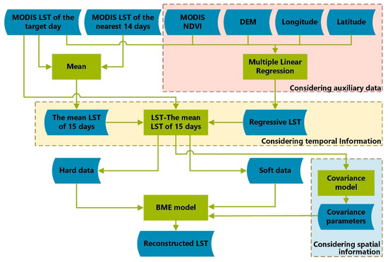 Flowchart describing the land surface temperature (LST) reconstruction model using the Bayesian maximum entropy (BME) method.