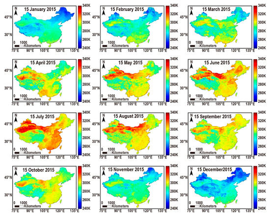 Spatial distribution of reconstructed daytime LST from 15 January to 15 December in 2015.