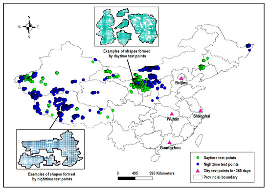 Since the study aimed at clear-sky LST reconstruction, it was not necessary to employ ground observation points for verification. First, this is because clear-sky LST is the theoretical value that is assumed not to be affected by clouds, while the ground observed value is the real value that is affected by clouds, so they cannot be directly compared. Secondly, this is because the acquisition time of the ground station is difficult to coincide with that of MODIS products, and there are also scale effects between points and surfaces. The verification method in this paper is for clear-sky LST. We selected some points with MODIS LST observations to cover them, reconstructed the LST of the covered points with the BME method, and then compared the reconstructed LST values with the known observations of MODIS LST. The verification points must have MODIS LST observations as references for the reconstructed LSTs. Therefore, we selected the points where the MODIS LST observations existed on the 15th of each month in 2015 as the verification points, which also helped to show the accuracy change of points with the same positions over time (Figure 4). There were 10,971 test pixels for the daytime (green points in Figure 4), including 330 forest pixels, 2683 grassland pixels, 537 cropland pixels, 7376 barren pixels, 38 urban pixels and 7 snow and ice pixels. There were 14,376 test pixels for the nighttime (blue points in Figure 4), including 218 forest pixels, 6040 grassland pixels, 425 cropland pixels, 7627 barren pixels, 425 urban pixels and 8 snow and ice pixels. Some of the verification points were spatially continuous and they formed regions of various shapes. The maximum diameter of the regions formed by the verification pixels was close to 60 km, and the estimation accuracy was thus also of reference value for the missing LST values caused by large cloud cover.