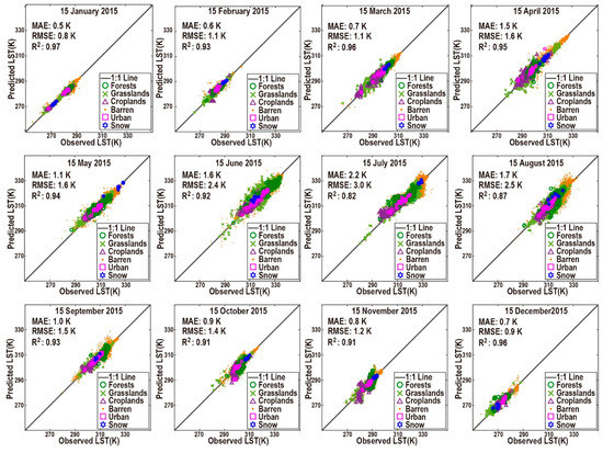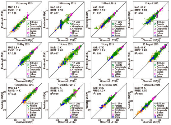 Scatter plots of reconstructed LST versus observed LST for 14,376 pixels for the nighttime from 15 January to 15 December in 2015.