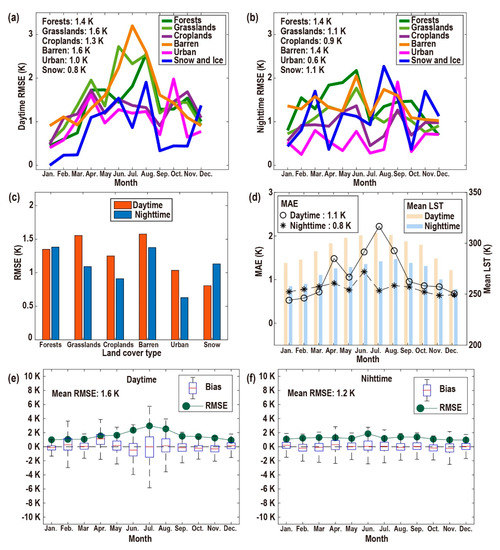 RMSE of (a) daytime LST and (b) nighttime LST for each land cover type from 15 January to 15 December in 2015; (c) overall average RMSE for each land cover type in 2015; (d) overall average mean absolute error (MAE) from 15 January to 15 December in 2015; bias and overall average RMSE for the daytime (e) and nighttime (f) from 15 January to 15 December in 2015.