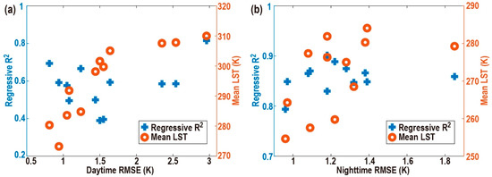 Correlation between multiple regressive R2, mean LST and RMSE for the (a) daytime and (b) nighttime.