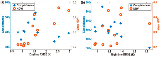 Correlation between the completeness of the observed LST, mean NDVI and RMSE for the (a) daytime and (b) nighttime.