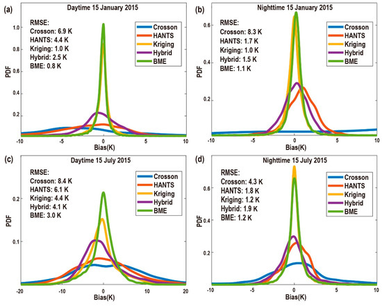 We compared the BME method with four other commonly used LST gap-filling methods, including Crosson’s method of supplementing MYD data with the same day’s MOD data [22], the time interpolation method HANTS [23], the Kriging spatial interpolation method, and the hybrid gap-filling method proposed by Li [30]. It is worth noting that the same hard data and the same spatial covariance model of the BME method were entered into Kriging, and the only difference was that the Kriging method does not consider soft data. The RMSEs and error distributions of each method are shown in Figure 11. In general, the accuracy of each method ranked from high to low, as follows: BME > Kriging > Hybrid > HANTS > Crosson. It appeared that Crosson’s method had the lowest accuracy, the BME method had the highest accuracy during the daytime, the Kriging method had the highest accuracy during the nighttime, the Hybrid method had a stable accuracy in the day and night, and HANTS had a significantly higher accuracy in the night than in the day.