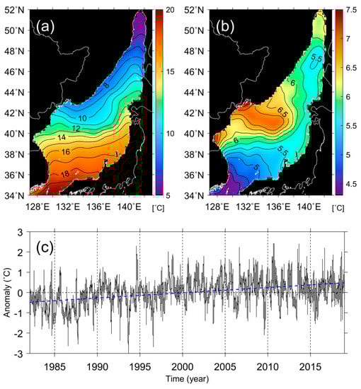 According to [], who analyzed seasonal trends in the global temperature for the period from 1979 to 2010, the SST in the Northern Hemisphere exhibited a significant warming trend for all seasons in the past decades. At that time, the warming rate was reported to be larger in autumn and winter than in spring and summer. A similar result for the SST warming of the EJS was reported, stating that the warming was more significant in the wintertime than in the summertime for the period from 1891 to 2005 []. As one of the effects of global climate change on changes in the SST variation in local regions, [] showed that the SST in the EJS exhibited an overall increase of more than 0.9 °C over the time period of 25 years, from 1982 to 2006, including a rapid increase (more than 12-fold) in the global warming rate at 1.67 °C decade−1 during the observation period from 1986 to 1998.