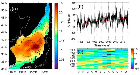 (a) Spatial distribution of eigenvectors from the first EOF mode using OISST anomaly data, for the observation period from 1982 to 2018, for the EJS; (b) temporal variability of the amplitude of (a), where the red dashed line is a least squares linear fit (); and (c) month-year plot of (b).
