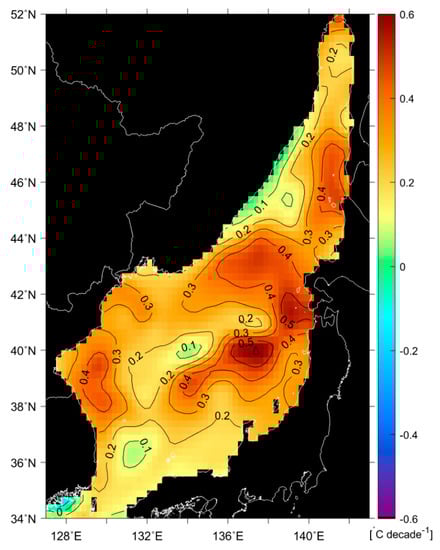 Due to global warming, much attention has been given to the obvious warming of the Earth, including the ocean, owing to the increase in the rate and amount of emitted greenhouse gases [,,]. The SST warming rate seems to be obviously detectable, as evidenced by the analyses of data from numerous SST databases worldwide (e.g., [,,,]). Recently, some studies reported a slowdown in the global ocean’s SST warming rate during recent decades [,,]. The occurrence of events with extremely high temperature has been increasing, yielding surface warming []. Conversely, the occurrence of extremely low-temperature events in the wintertime has also been increasing, owing to changes in the atmospheric circulation, which might slow down the SST increase rate []. In local sea regions, the effect of extremely hot and cold days on the SST increase rate was also investigated for the East China Sea []. Therefore, it is important to elucidate the impact of climate change on local seas, especially the marginal seas of the global ocean; this understanding can help in the development of feasible strategies to address climate change.