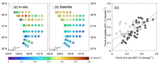 (a) Trends (°C decade−1) from in-situ near-surface water temperatures measurements, where the black circles represent the trends at 95%-confidence level; (b) same but for satellite SSTs; and (c) comparison between trends from in-situ and satellite SST, where the light (dark) grey dots represent the points close to (far from) the coast and the blue (red) dashed line represents its least squares linear fit (blue line: (R2 = 0.36), red line: (R2 = 0.67)).