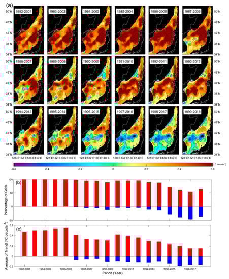 As demonstrated by the analysis of long-term variations of the SSTA and the time-varying amplitude of the first EOF mode of the SSTA (Figure 2 and Figure 3b), the slopes for those features that showed increasing trends exhibited slow-time-scale variations with relatively rapid warming during the initial observation period decades, while milder warming was observed during recent decades. To analyze the temporal variability in the warming trends, we calculated the multi-year moving trends in the SST by applying a 20-year-wide temporal domain for the estimation of linear trends, for all spatial grids. The 20-year period was determined by considering relatively high interannual variability of SSTs in the EJS at dominant frequency amounting to 7 years according to the previous study []. Figure 6a shows the time series of the spatial distribution for the 20-year-long moving trends in the SST variations, during the observation period from 1982 to 2018. The first image shows the SST warming rates over the entire region for the first 20 years of observation, from 1982 to 2001. The warming trends increased continuously, until the period from 1986 to 2005; however, they began to reduce gradually and even switched to cooling from the SPF region, for the observation period from 1987 to 2006. Especially, they seemed to have been strongly reducing along the Russian coast, for the observation period from 1988 to 2007. One notable feature of that trend is that a negative trend, that is SST cooling, appeared along the SPF in the central portion of the EJS, as can be clearly seen for the observation period from 1996 to 2015, as well as for the following observation period.