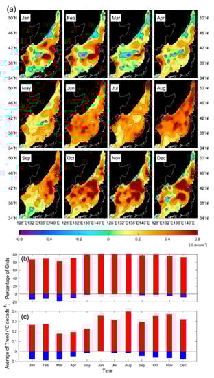 The areal coverage of cooling constituted a relatively high fraction, from 7% in December to the maximum of 18% in March (Figure 7b) in winter and spring. The strongest warming trend of ~0.40 °C decade−1 appeared in August, while the weakest warming trend, ~0.18 °C decade−1, appeared in March (Figure 7c). Concerning the cooling, the strongest cooling trend was about –0.09 °C decade −1, and was observed for February and March.