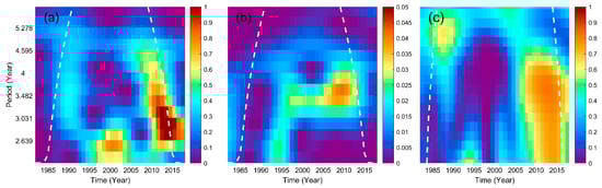 What causes the observed periodic appearance of extremely low SST events? One representatively influential climate index that captures SST variations in the EJS is the AO index. We studied the variability of AO, which, as we posited, could affect the SST in winter in the EJS, especially with respect to extreme events. Thus, we sought to determine if there was significant change in the energy of AO variations with time by performing wavelet analysis of available data; the results of this analysis are shown in Figure 9a. When considering time periods longer than 3 years, the AO index exhibited relatively low variability in the earlier decades of the observation period. However, higher variability with strong energy variations appeared in the recent decades of the observation period, as shown in Figure 9a. The results of the wavelet analysis of the AO for wintertime data revealed a large variability with 2–2.5 year-long cycles around the year 2000, and with 2.5–3.5 year-long cycles after 2010 (Figure 9a). This suggests that the higher variability of changes in the atmospheric and oceanic features in the Arctic Ocean may be related to the recent fast warming and melting of the sea ice [,,]. Next, we asked whether this AO variability can affect the SST trends in the EJS, which is one of the marginal seas of the Northwest Pacific in the mid-latitude region. To answer this question, we performed wavelet analysis of SST variations in the ELDs, and the results of this analysis are shown in Figure 9b. The highest variability in the SSTA was observed in 2010, with a temporal period of ~3.5 years.