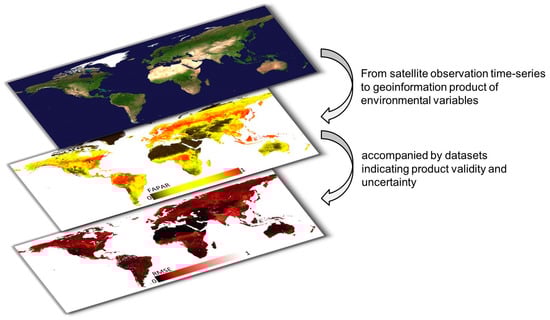 Earth’s biosphere is exposed to increasing pressure from environmental changes, many of which are of anthropogenic cause (e.g., global change [1]). Various associated manifestations can be observed in the land surface domain of the planet. To effectively address related issues, knowledge on environmental indicators at a high spatial and temporal resolution is required to perform detailed analyses in different fields [2,3,4,5]. It is crucial that the acquired information is reliable in order to minimize error propagation in further applications, thus creating the need for substantial validation efforts. For the quantification and prediction of planet-wide processes, it is furthermore necessary to conduct highly frequent and accurate investigations at the continental to global scale over extended periods of time [6]. The challenge of creating datasets that meet these requirements can be approached efficiently by satellite remote sensing. Large spatial coverage (“wall to wall”) and high revisit times of specific spaceborne instruments promote the derivation of time-series data, containing extensive geospatial information. The scientific demand to engage in global-scale environmental questions has consequently facilitated the growth of this field [7,8]. This development was possible due to the release of well characterized and calibrated satellite data and the pressing demand from the user community to have access to consistent and ready-to-use products [9].