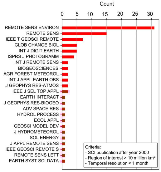 The goal of this review was to provide an overview of validation methods in Science Citation Index (SCI)-listed studies since the year 2000, which assess the quality of large-area EO time-series regarding land surface variables (Figure 2). Time-series were considered that show a continental to global coverage (at least a 10 million km² region of interest) and feature a minimal temporal resolution of one month. This thus excluded multi-annual land use/land cover (LULC) datasets, which typically feature at least an annual temporal resolution or less according to the definition of the Food and Agriculture Organization (FAO) [41]. However, comprehensive overview papers on the topic of LULC validation are available for the interested reader [38,40,42,43,44]. Furthermore, studies showing an adequate spatiotemporal extent and resolution but concentrate only on a small number of local sites for validation and/or specific points in time were not regarded in this review due to the lack of coherence of the product and validation. The considered criteria in this review purposely targeted datasets for which classical good practice validation methods of spatial products [45] are unfavorable. Next to reviewing validation methods, we also targeted quantitative questions regarding the involved data as well as thematic and spatial foci to present a bigger picture associated with validation.