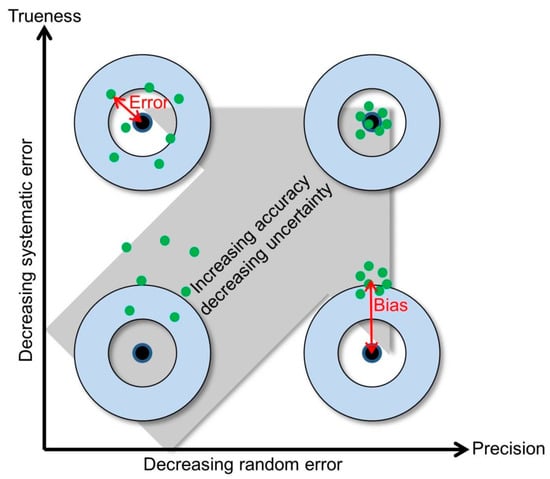 Uncertainty is referred to as the potential deficiency in any phase or activity of the modeling process that is due to a lack of knowledge [49]. It is reported alongside result values and specifies the range in which the true value is asserted to be found. Uncertainty addresses both systematic and random errors (Figure 3). Within the domain of spatial data, the correct use of uncertainty concepts is furthermore subject to the concreteness of the object definition (e.g., category definition in classification). For well-defined objects, uncertainty originates in errors and has a probabilistic nature, whereas poorly defined objects introduce vagueness or ambiguity, which can be approached by fuzzy set theory or lead to discord or non-specificity, respectively [50].