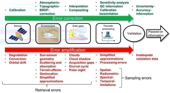 Satellite sensors need to convert the electromagnetic signal from earth in voltage and digital numbers in order to obtain reflectance or radiance values. For a reliable conversion, the constant calibration of sensors is essential [29,52] to counteract sensor-prone error sources (e.g., sensor degradation, different sensor sensitivity for specific bandwidths). For this purpose, modern instruments, such as MODIS, employ onboard calibration systems. Furthermore, deviations due to variable sun–sensor geometry and geolocation errors have to be attended to. Geolocation uncertainties can be an issue due to varying projection systems, target shift, or different point spread functions [53]. Additionally, orbital drift has to be taken into account, as, for example, the orbital drift of each National Oceanic and Atmospheric Administration (NOAA) satellite during their lifetime evokes a cooling effect in advanced very high resolution radiometer (AVHRR) LST products [54]. The next step is the correction of signal alternations induced on the path from the target to the sensor. Outgoing radiance consists of components affected by environmental influences and atmospheric absorption and scattering effects. To obtain surface reflectance information, atmospheric correction is commonly applied, along with topographic correction and bidirectional reflectance distribution functions (BRDFs). For passive microwave observations, man-made radio frequency interference is also able to contaminate signals [55]. Once the corrected data is accessible, successive error sources are introduced in the subsequent processing. Model uncertainties mainly relate to simplified approximations of natural variability [56] and data gap handling. Main causes for temporal inconsistency in optical remote sensing data are data gaps due to cloud cover. Data quality suffers under cloud and cloud shadow contamination by amplified variance and abnormal error distribution in the data [57]. Depending on the object of investigation, snow cover and coarse temporal resolution can also cause data inconsistency. To interpolate data gaps, several reconstruction models (e.g., harmonic analysis, double logistic, asymmetric Gaussian or Whittaker smoother, Savitzky–Golay filter) have been established [58]. Gap-corrected data, however, have the potential for implications in downstream applications, as incorporated uncertainty is carried further to subsequent models [28]. A different approach to gain consistent time-series presents value compositing (e.g., maximum value), where multiple images are processed for a preset period of time to create representative, cloud-free datasets with the least atmospheric attenuation and viewing geometry effects [59]. This can reduce the impact of missing data and unexpected day-to-day variations. However, the application of filters and compositing comes with the disadvantage of information loss and lower temporal consistency [48,55]. For regions with a high frequency of gaps (e.g., tropical areas), even composite products often contain extensive gaps, which has become increasingly problematic in areas where no alternative source of geospatial datasets is available [28]. To oppose ambiguous observations, quality control (QC) is used to provide information on the retrieval quality by flagging data acquisitions. This procedure adds quality indicators to the original observation without modifying or removing it [60]. As a result, the anticipation of systematic errors related to the shortcoming of retrieval algorithms and inaccurate prior knowledge [57] can be improved. Further accuracy-limiting factors are of a technological nature, concerning the sensor’s spatial (geometric), radiometric, spectral, and temporal resolution [61], which can be summarized as sampling errors. These errors become effective if information is assessed at a level of detail that cannot be properly sustained by the capabilities of the data acquisition mechanism.