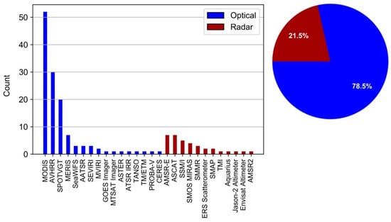 In the radar domain, one of the primary sensors is the Advanced Microwave Scanning Radiometer-Earth Observing System (AMSR-E), although its data availability ceased in 2011. The same degree of utilization is seen for the Meteorological Operational Satellites (MetOp) Advanced Scatterometer (ASCAT), followed by the Special Sensor Microwave/Imager (SSM/I).