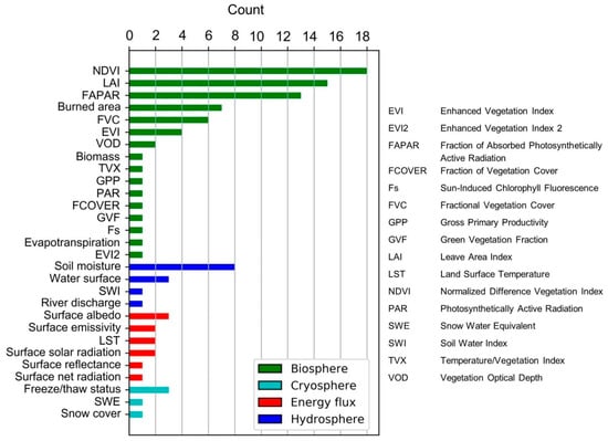 In this review, medium resolution optical sensors specially show high employment. MODIS data is most frequently used (52 studies). For the pre-MODIS era, AVHRR was the prevalent sensor for extensive global change studies because its visible red and near infrared channels enabled the estimation of NDVI from 1981 onwards [59]. Due to the utilization of MODIS, AVHRR, and SPOTVGT (Figure 5), the optical domain is generally represented to a much higher degree (78.5%) compared to radar-orientated research (21.5%). As the main focus of studies lies on vegetation, a large part of the investigations in the scope of this review are facilitated by the features of optical sensors. This is also reflected by the most frequently utilized variables (Figure 6). A relatively small fraction of the optical domain is furthermore constituted by the thermal sector, which is represented by AVHRR [77], MODIS [3,28,54], and AATSR [54] thermal infrared sensors.