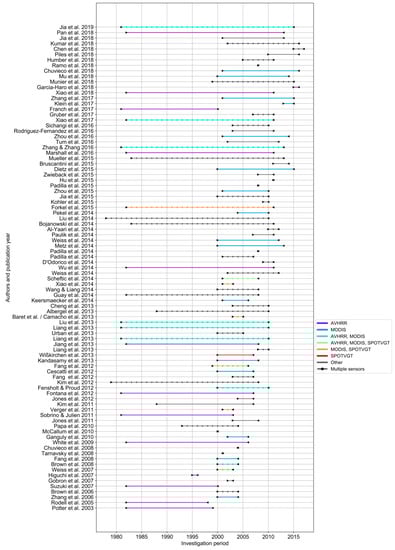 The review of investigation periods has shown time spans from single years to several decades (Figure 7). The longest study period (34 years) is based on a combination of the primarily used sensors AVHRR and MODIS [84].