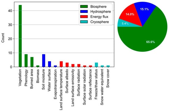 A variety of time-series-derived multitemporal variables have been employed in the studies (Figure 6). Mainly geophysical variables (defined by physical units) and index variables (dimensionless) were utilized. Thematic variables, which typically feature a larger amount of analyst bias [12], are found in burned area, water surface, and freeze/thaw status investigations. Overall, the majority of studies facilitated the analysis of vegetation-associated variables (71.8%). To access specific variables or implement validation with regards to other factors, additional datasets are required [21,78,79]. This led to a frequent application of auxiliary data (e.g., surface temperature, land cover, precipitation, or digital elevation models) along with primary time-series.